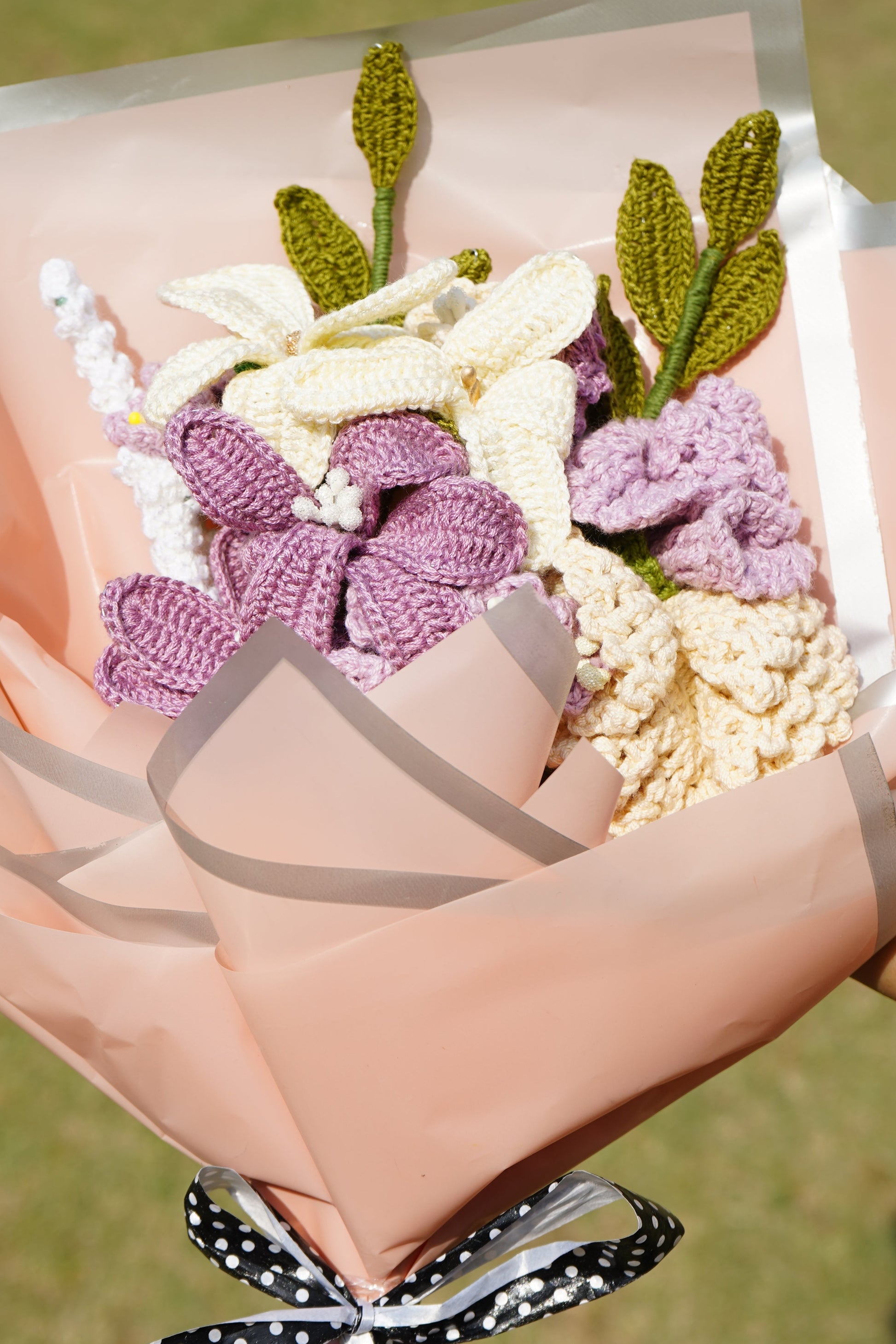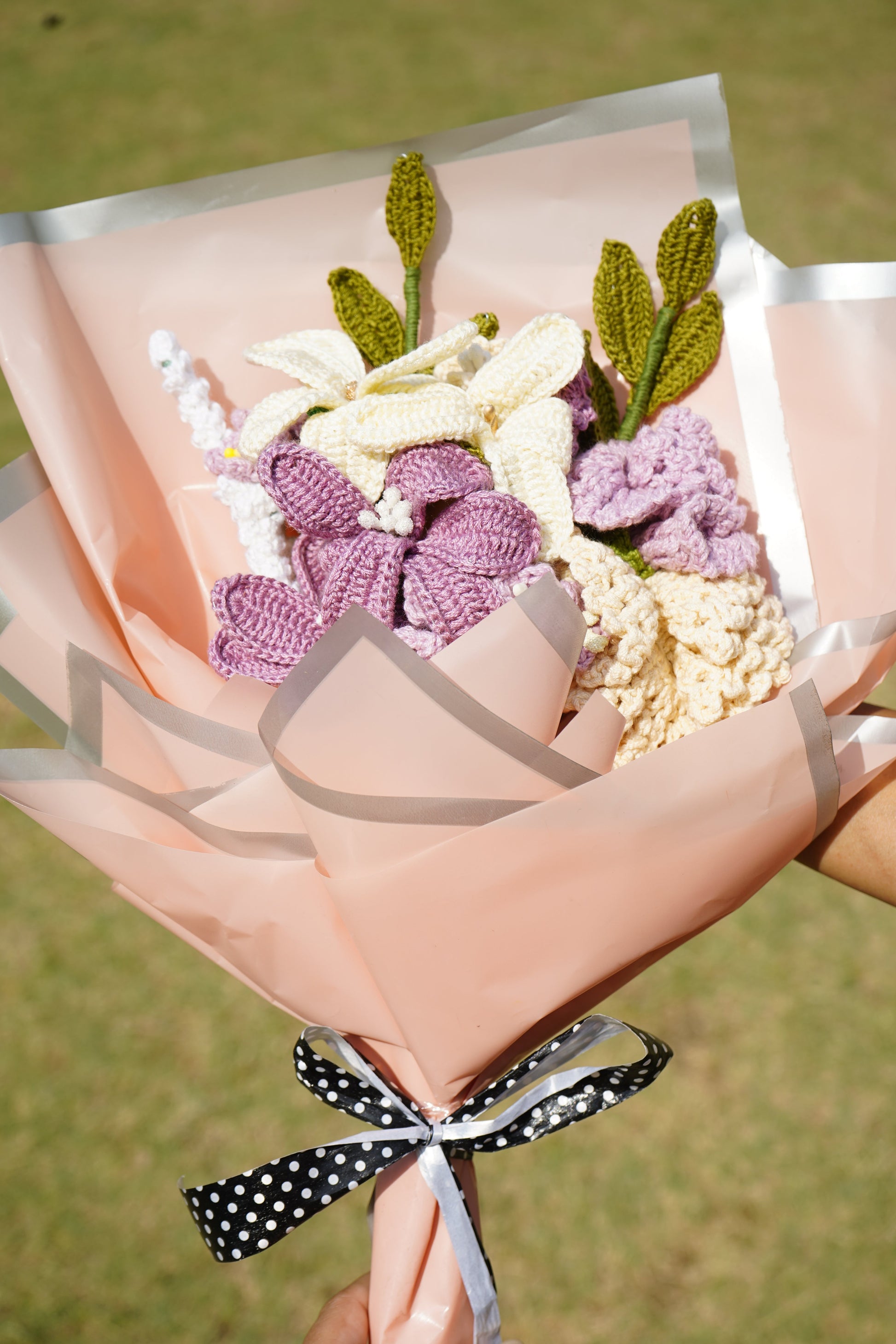 A graceful blend of traditional charm and soft textures, this handcrafted crochet bouquet features soothing hues of champa flowers and barmasi blooms. A perfect piece for heartfelt gifting, elegant décor, or a timeless keepsake wrapped in soft pink paper and a ribbon.